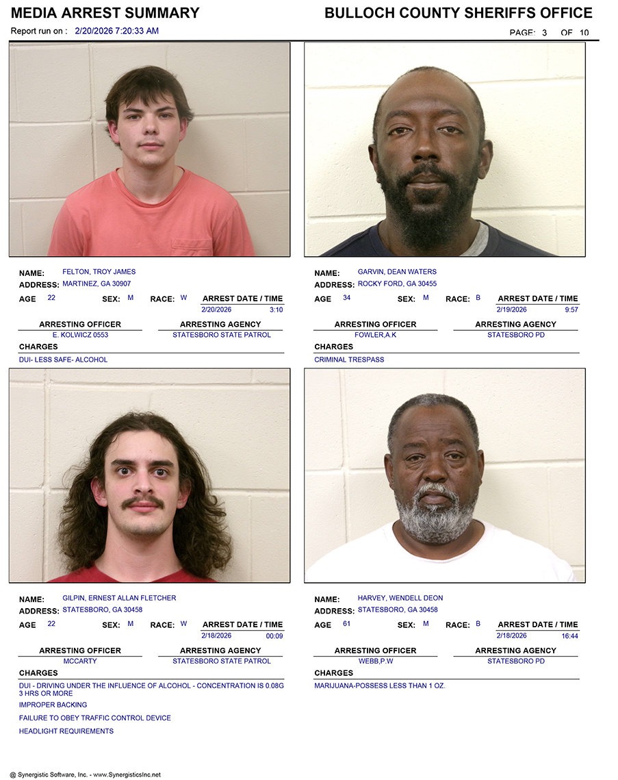 These records are matters of public information provided by the Bulloch County Sheriff’s Office. Booking reports are details of arrests only. All persons below are considered to be innocent unless proven otherwise in a court of law.