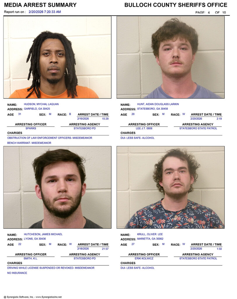 These records are matters of public information provided by the Bulloch County Sheriff’s Office. Booking reports are details of arrests only. All persons below are considered to be innocent unless proven otherwise in a court of law.