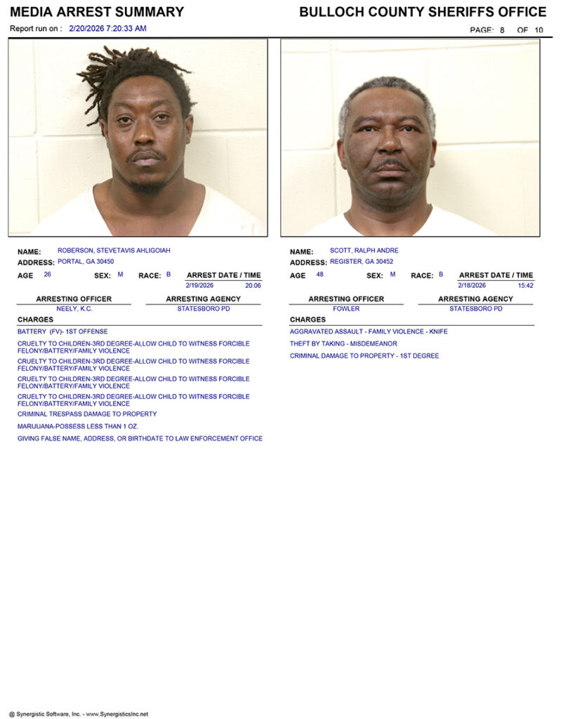 These records are matters of public information provided by the Bulloch County Sheriff’s Office. Booking reports are details of arrests only. All persons below are considered to be innocent unless proven otherwise in a court of law.