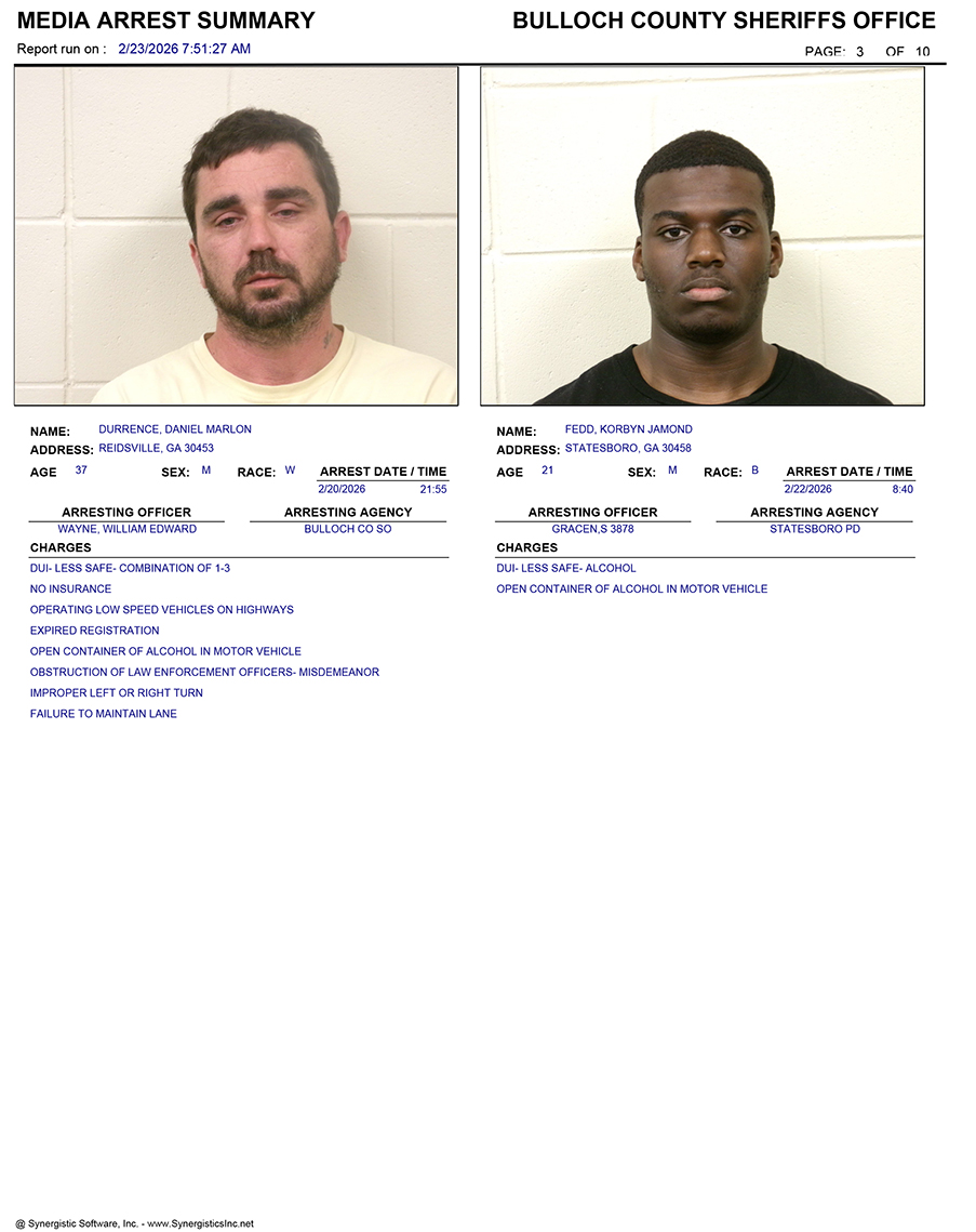 These records are matters of public information provided by the Bulloch County Sheriff’s Office. Booking reports are details of arrests only. All persons below are considered to be innocent unless proven otherwise in a court of law.