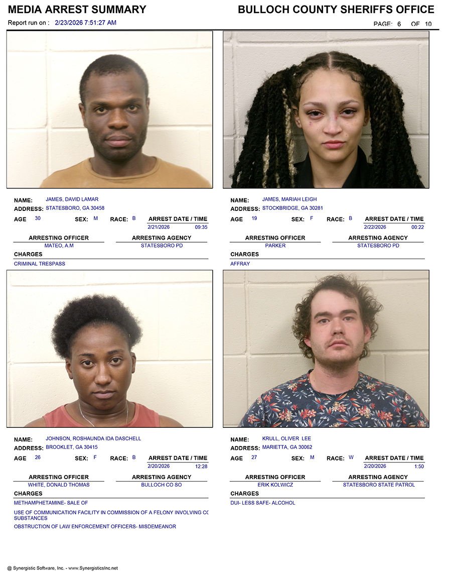 These records are matters of public information provided by the Bulloch County Sheriff’s Office. Booking reports are details of arrests only. All persons below are considered to be innocent unless proven otherwise in a court of law.
