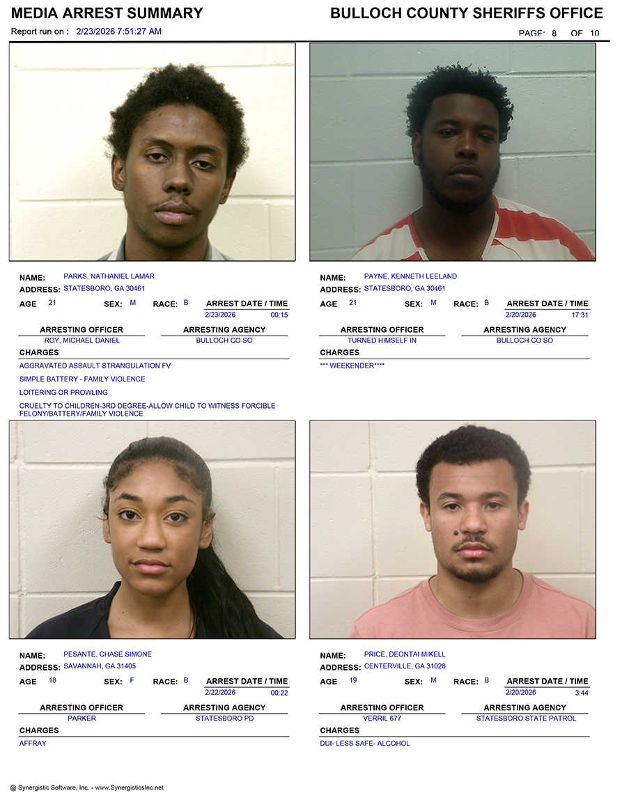 These records are matters of public information provided by the Bulloch County Sheriff’s Office. Booking reports are details of arrests only. All persons below are considered to be innocent unless proven otherwise in a court of law.