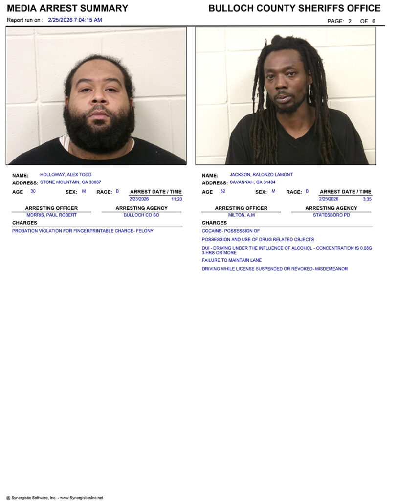 These records are matters of public information provided by the Bulloch County Sheriff’s Office. Booking reports are details of arrests only. All persons below are considered to be innocent unless proven otherwise in a court of law.