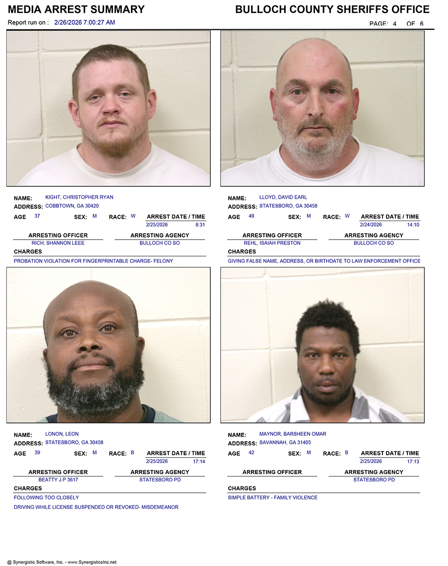 These records are matters of public information provided by the Bulloch County Sheriff’s Office. Booking reports are details of arrests only. All persons below are considered to be innocent unless proven otherwise in a court of law.