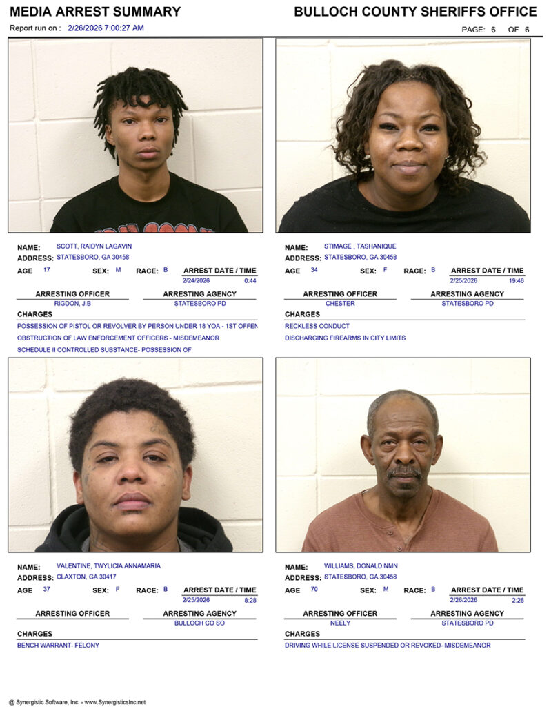 These records are matters of public information provided by the Bulloch County Sheriff’s Office. Booking reports are details of arrests only. All persons below are considered to be innocent unless proven otherwise in a court of law.