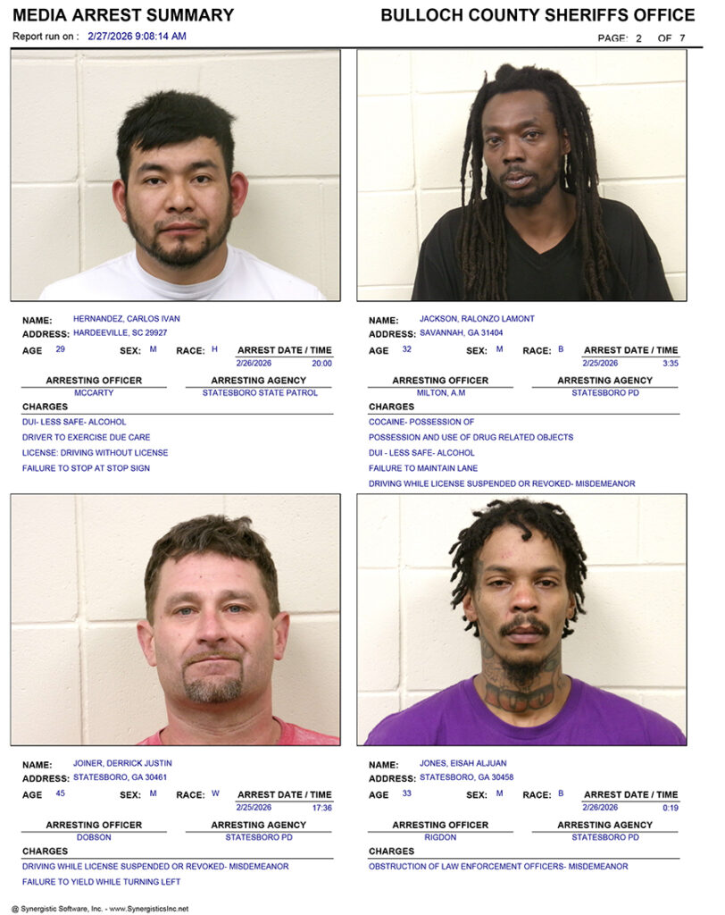 These records are matters of public information provided by the Bulloch County Sheriff’s Office. Booking reports are details of arrests only. All persons below are considered to be innocent unless proven otherwise in a court of law.
