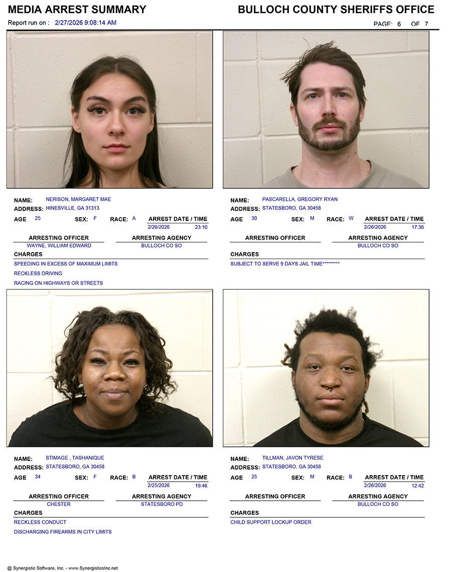 These records are matters of public information provided by the Bulloch County Sheriff’s Office. Booking reports are details of arrests only. All persons below are considered to be innocent unless proven otherwise in a court of law.