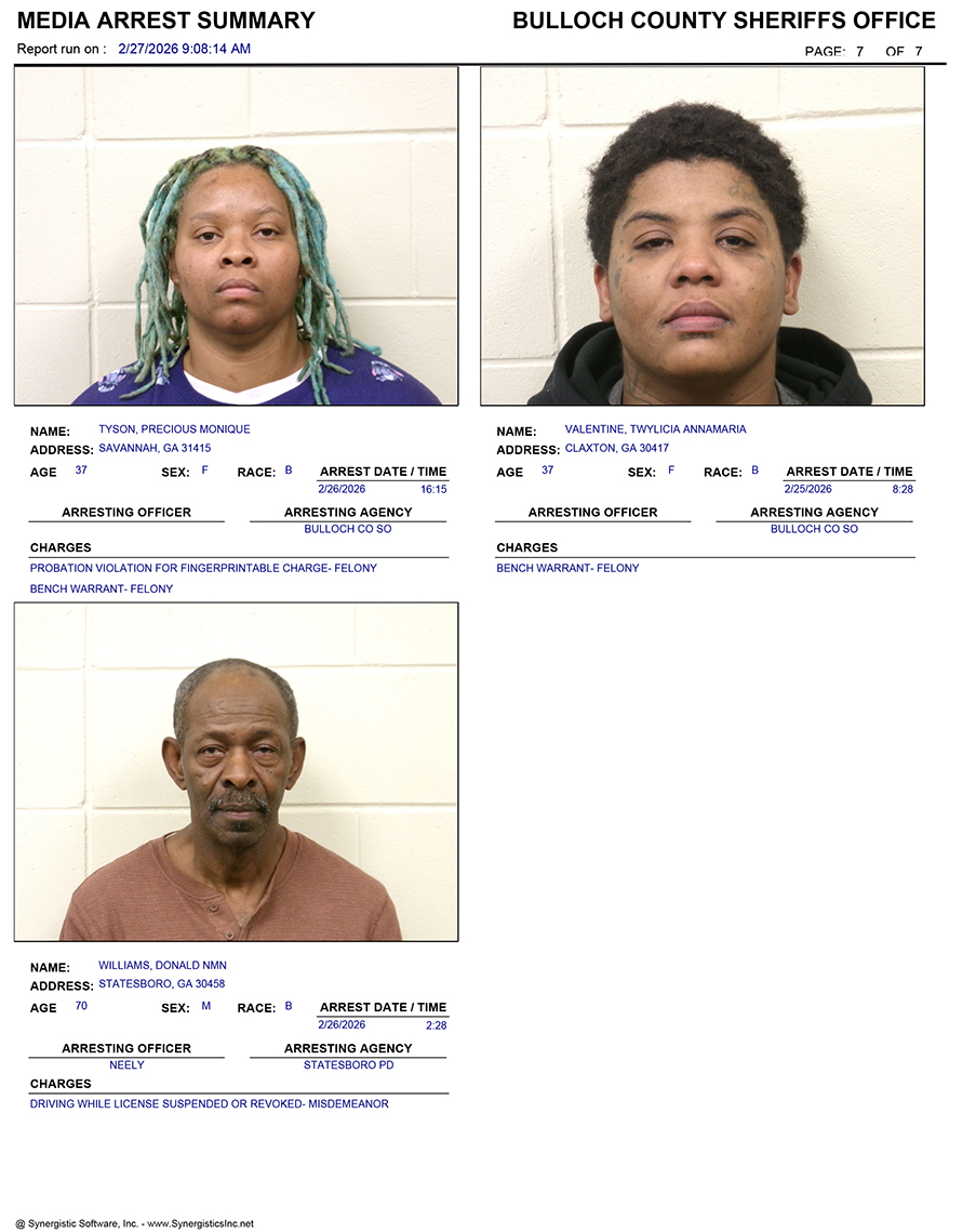 These records are matters of public information provided by the Bulloch County Sheriff’s Office. Booking reports are details of arrests only. All persons below are considered to be innocent unless proven otherwise in a court of law.