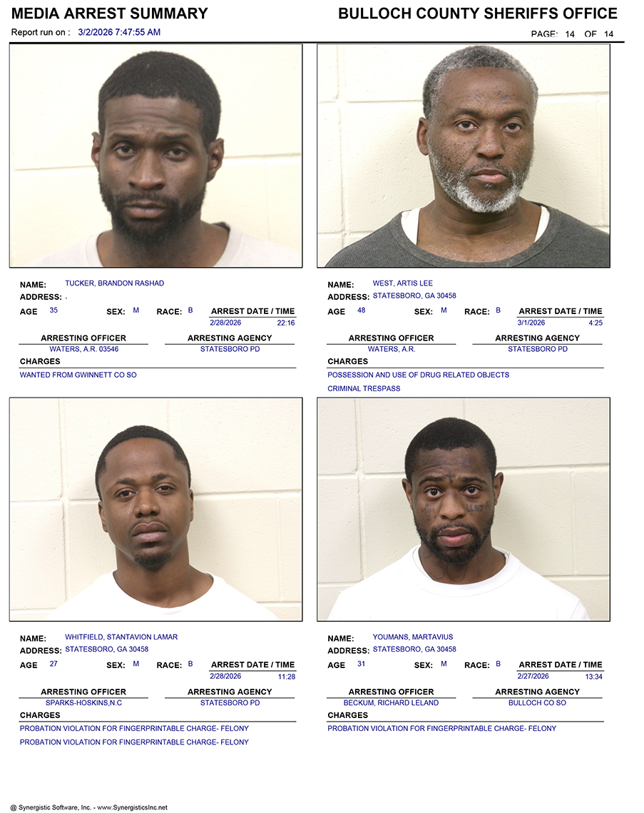 These records are matters of public information provided by the Bulloch County Sheriff’s Office. Booking reports are details of arrests only. All persons below are considered to be innocent unless proven otherwise in a court of law.