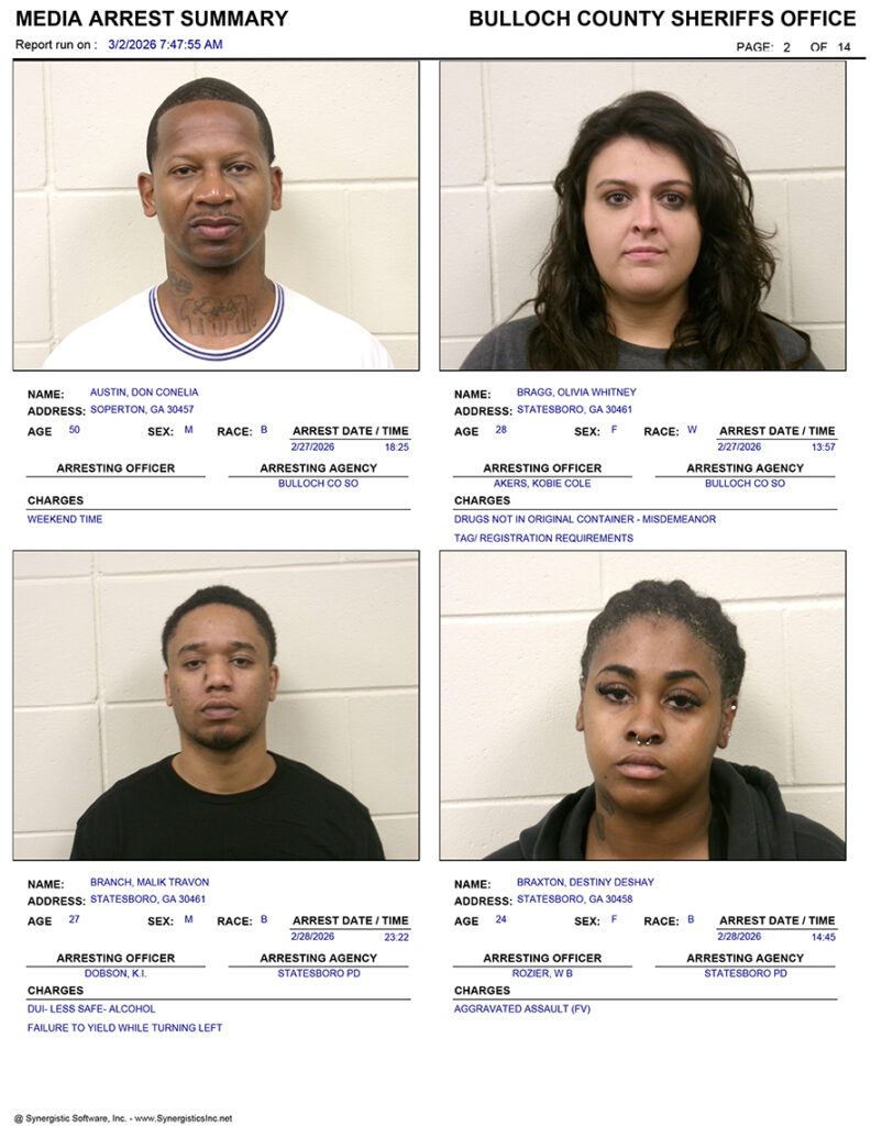 These records are matters of public information provided by the Bulloch County Sheriff’s Office. Booking reports are details of arrests only. All persons below are considered to be innocent unless proven otherwise in a court of law.