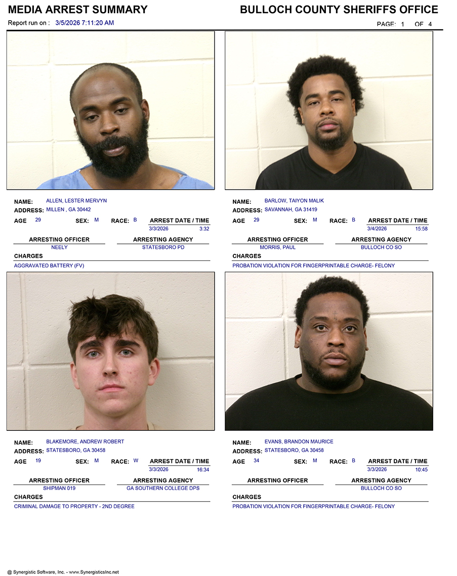 These records are matters of public information provided by the Bulloch County Sheriff’s Office. Booking reports are details of arrests only. All persons below are considered to be innocent unless proven otherwise in a court of law.