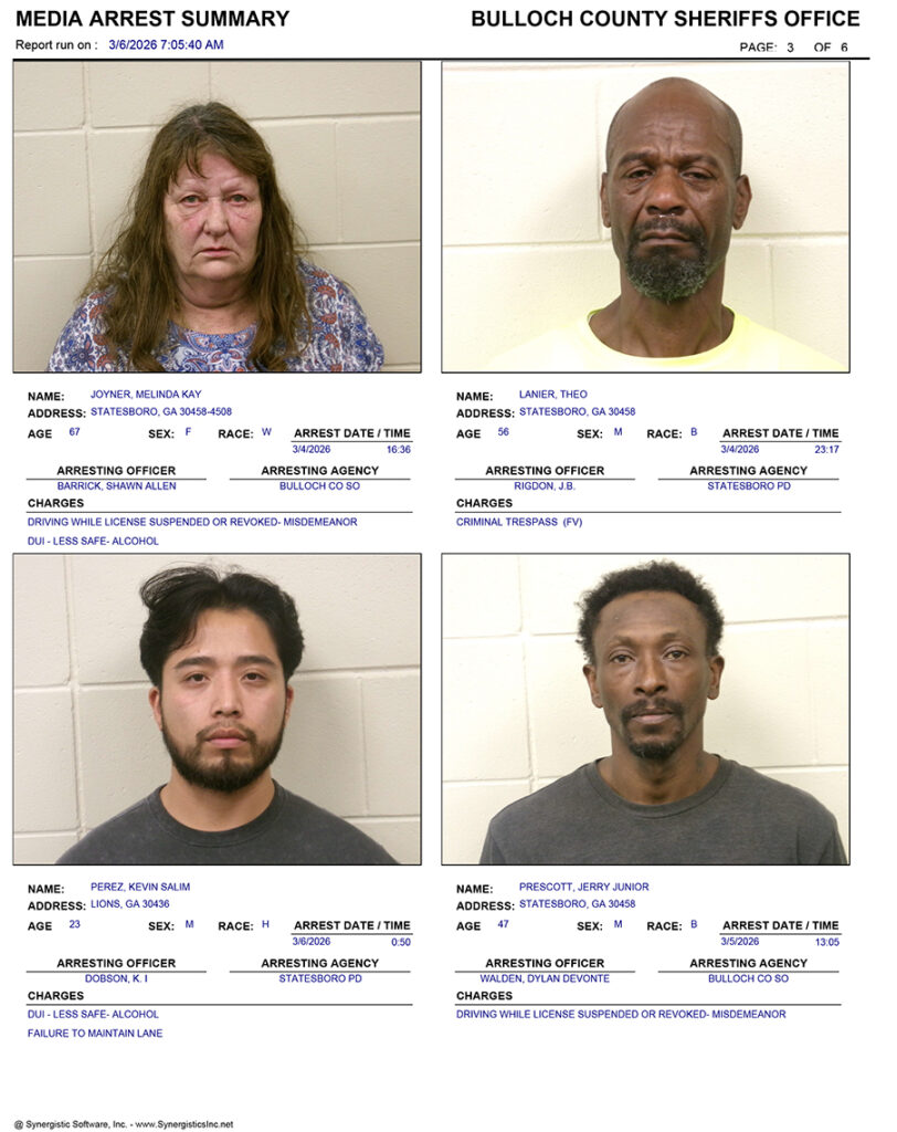 These records are matters of public information provided by the Bulloch County Sheriff’s Office. Booking reports are details of arrests only. All persons below are considered to be innocent unless proven otherwise in a court of law.