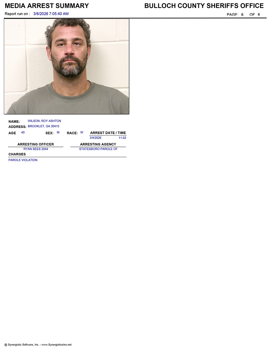 These records are matters of public information provided by the Bulloch County Sheriff’s Office. Booking reports are details of arrests only. All persons below are considered to be innocent unless proven otherwise in a court of law.