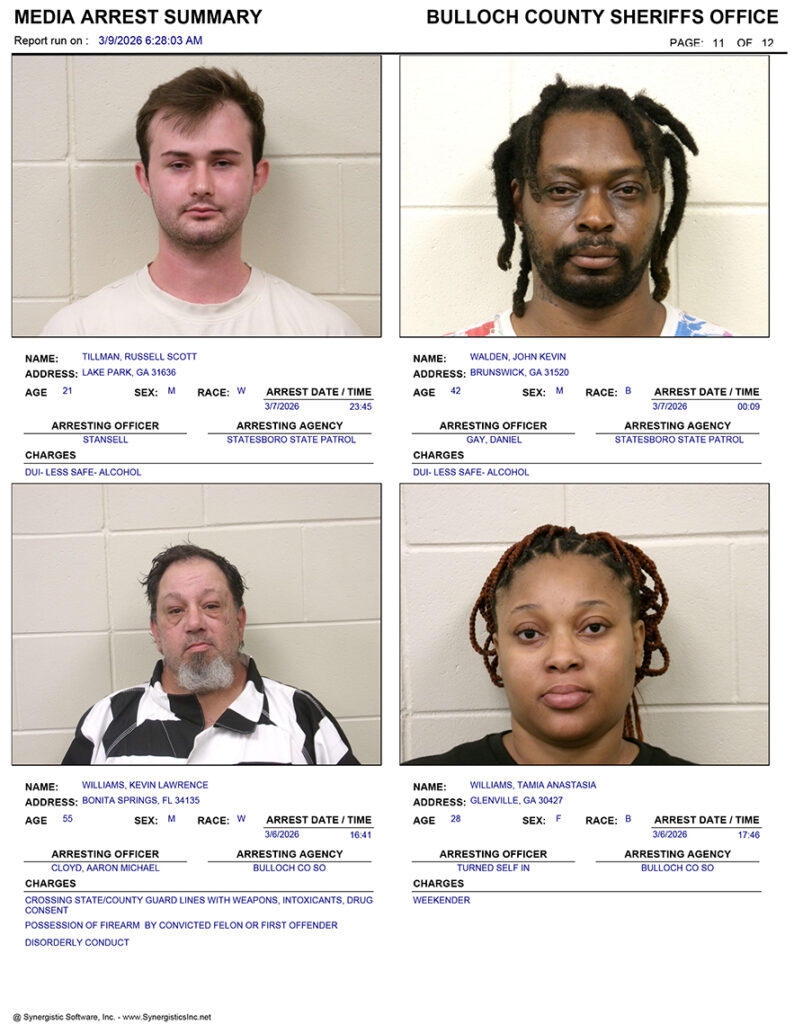These records are matters of public information provided by the Bulloch County Sheriff’s Office. Booking reports are details of arrests only. All persons below are considered to be innocent unless proven otherwise in a court of law.
