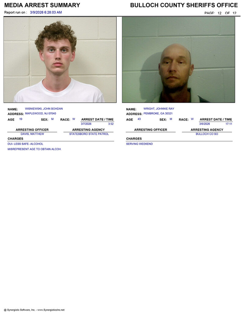 These records are matters of public information provided by the Bulloch County Sheriff’s Office. Booking reports are details of arrests only. All persons below are considered to be innocent unless proven otherwise in a court of law.