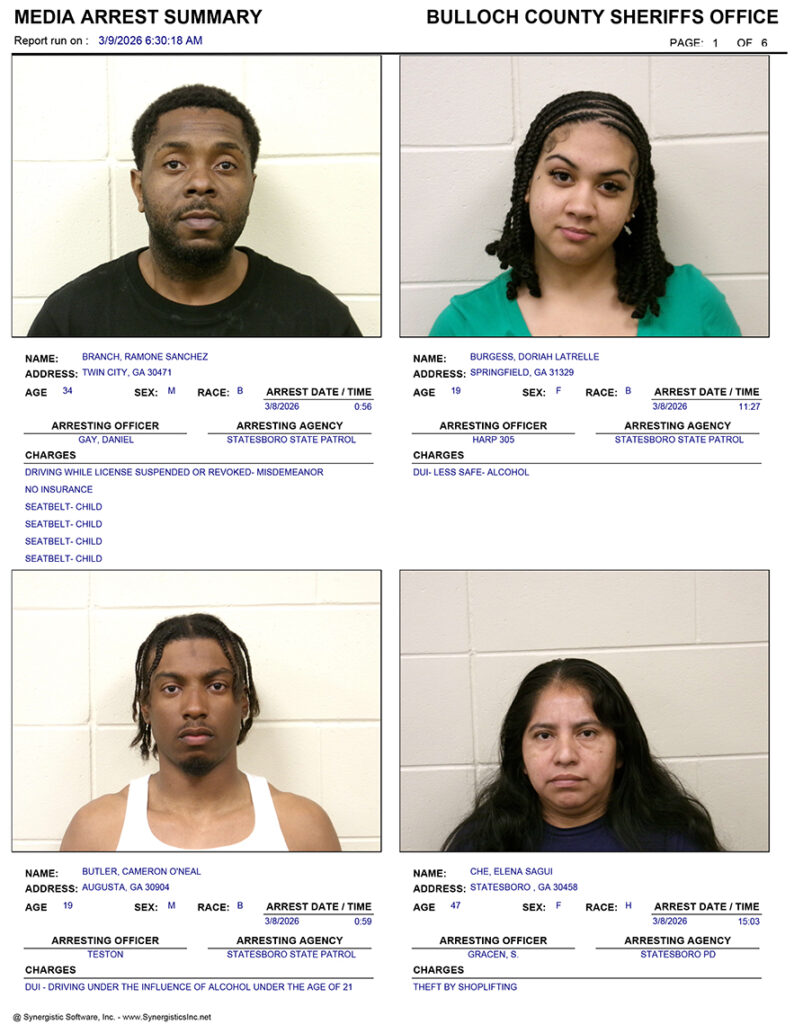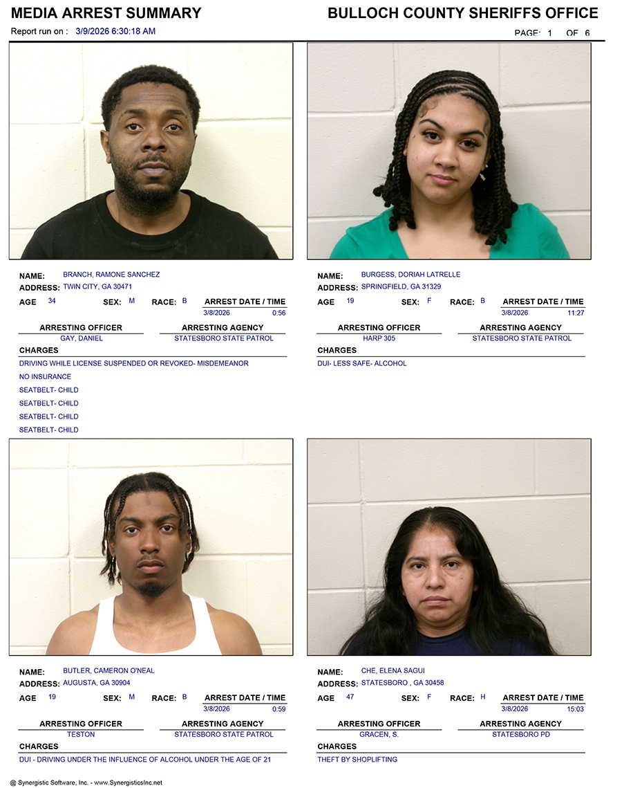 These records are matters of public information provided by the Bulloch County Sheriff’s Office. Booking reports are details of arrests only. All persons below are considered to be innocent unless proven otherwise in a court of law.