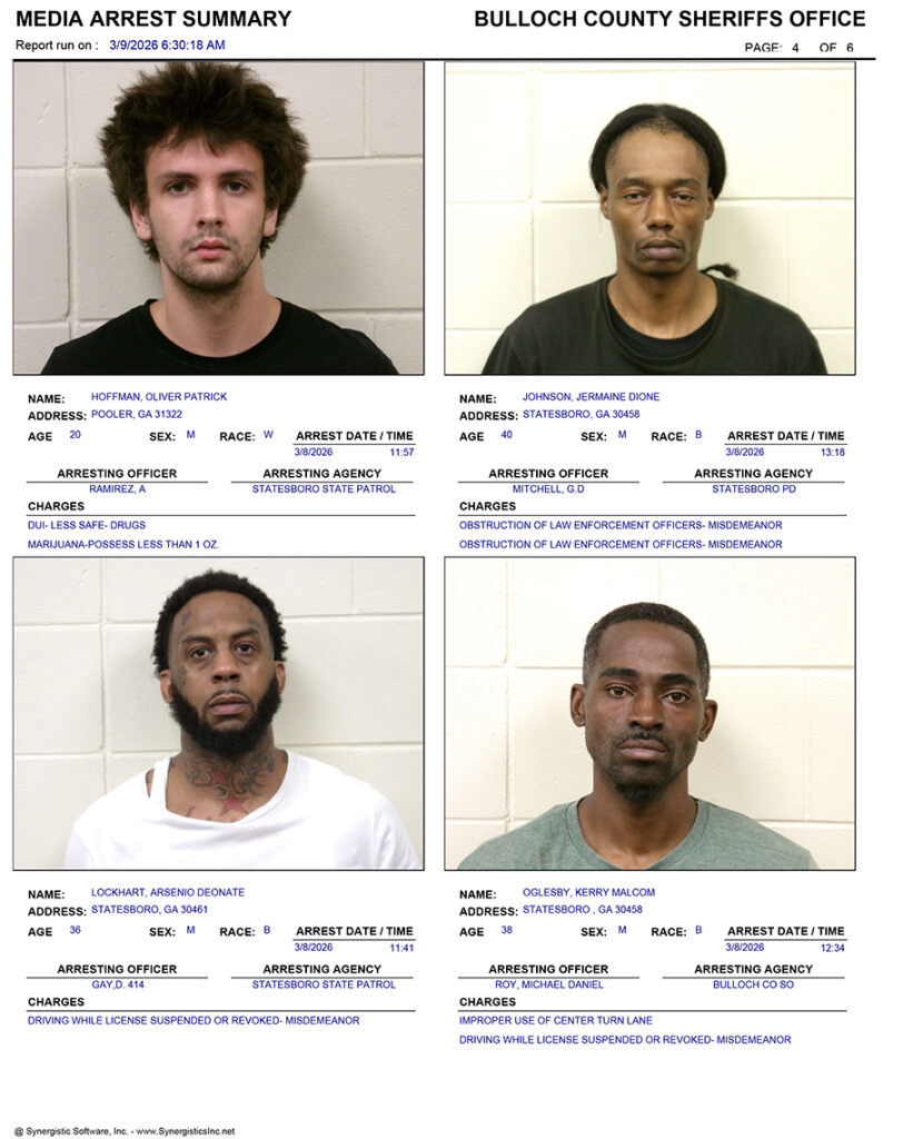 These records are matters of public information provided by the Bulloch County Sheriff’s Office. Booking reports are details of arrests only. All persons below are considered to be innocent unless proven otherwise in a court of law.