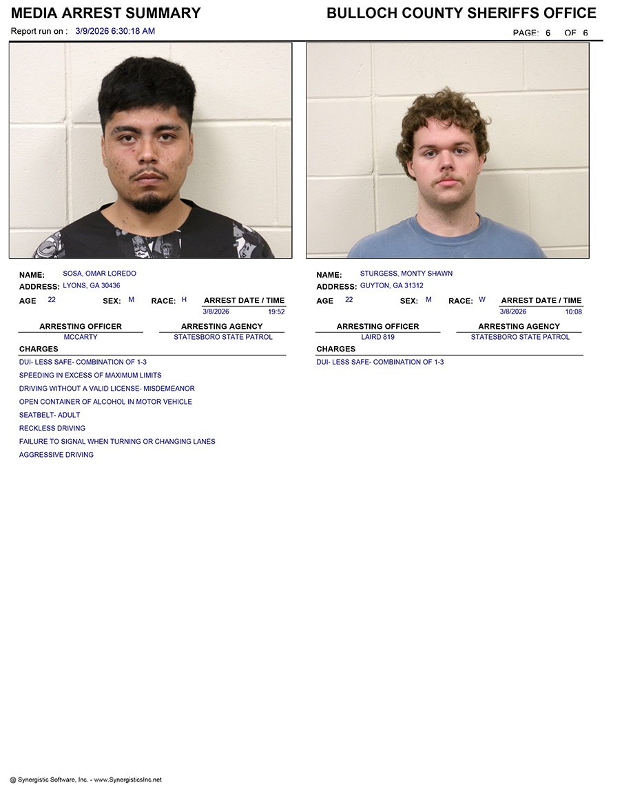 These records are matters of public information provided by the Bulloch County Sheriff’s Office. Booking reports are details of arrests only. All persons below are considered to be innocent unless proven otherwise in a court of law.