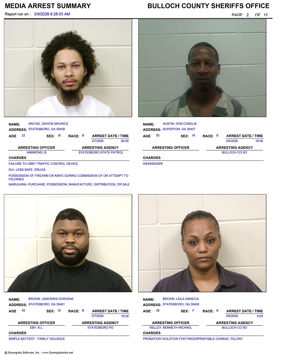 These records are matters of public information provided by the Bulloch County Sheriff’s Office. Booking reports are details of arrests only. All persons below are considered to be innocent unless proven otherwise in a court of law.