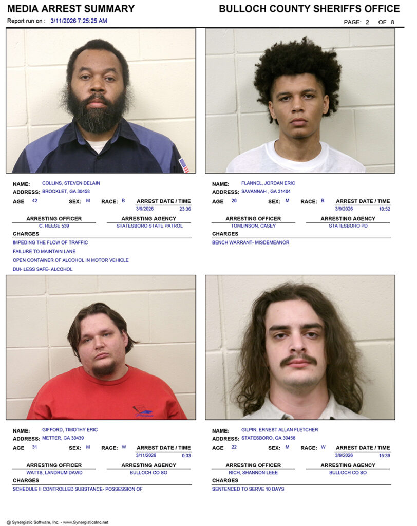 These records are matters of public information provided by the Bulloch County Sheriff’s Office. Booking reports are details of arrests only. All persons below are considered to be innocent unless proven otherwise in a court of law.