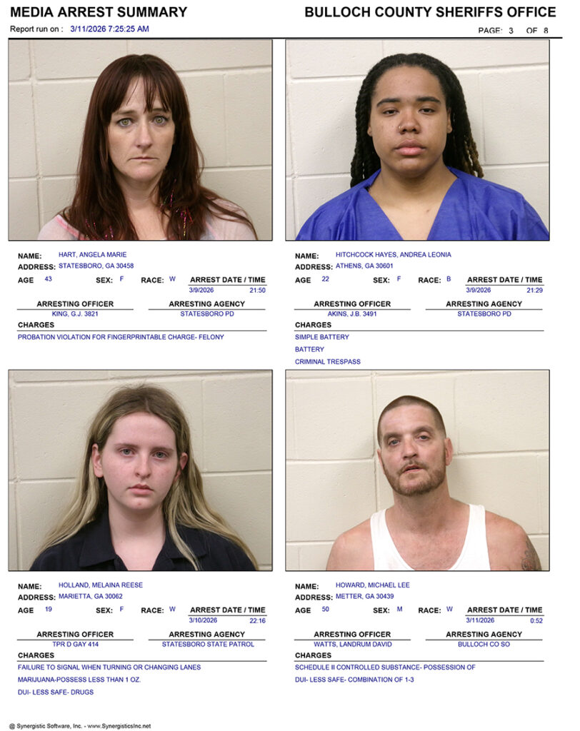 These records are matters of public information provided by the Bulloch County Sheriff’s Office. Booking reports are details of arrests only. All persons below are considered to be innocent unless proven otherwise in a court of law.