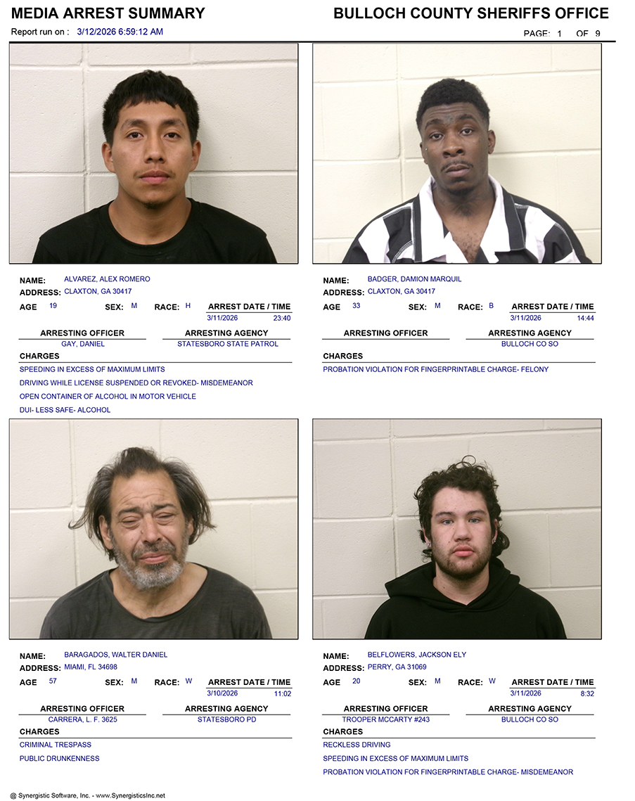 These records are matters of public information provided by the Bulloch County Sheriff’s Office. Booking reports are details of arrests only. All persons below are considered to be innocent unless proven otherwise in a court of law.