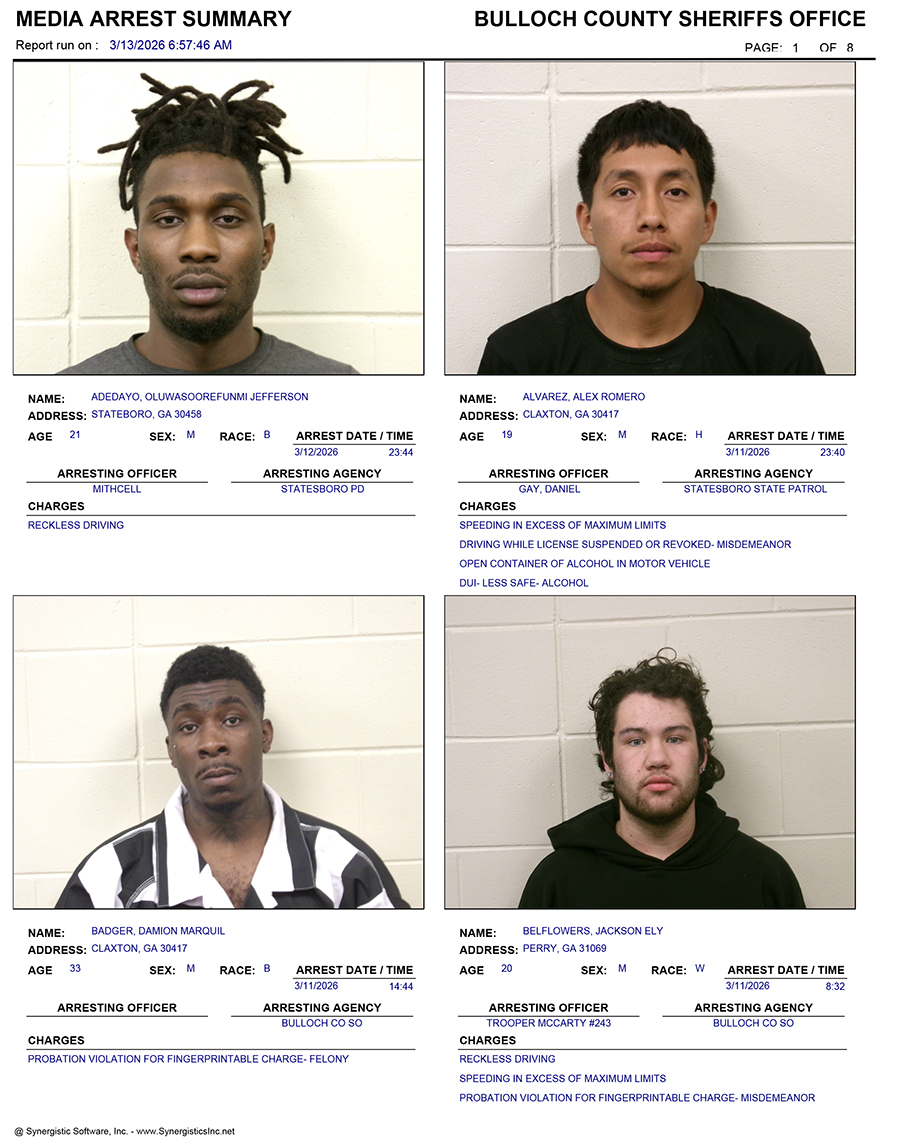 These records are matters of public information provided by the Bulloch County Sheriff’s Office. Booking reports are details of arrests only. All persons below are considered to be innocent unless proven otherwise in a court of law.