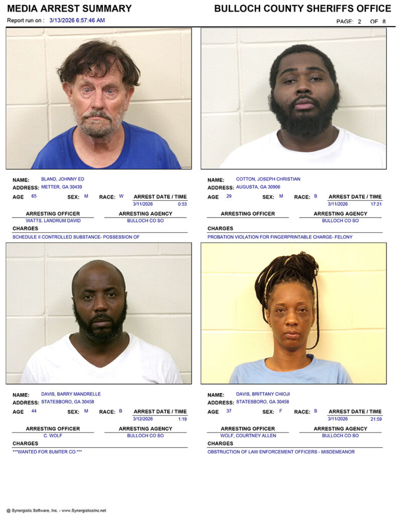 These records are matters of public information provided by the Bulloch County Sheriff’s Office. Booking reports are details of arrests only. All persons below are considered to be innocent unless proven otherwise in a court of law.