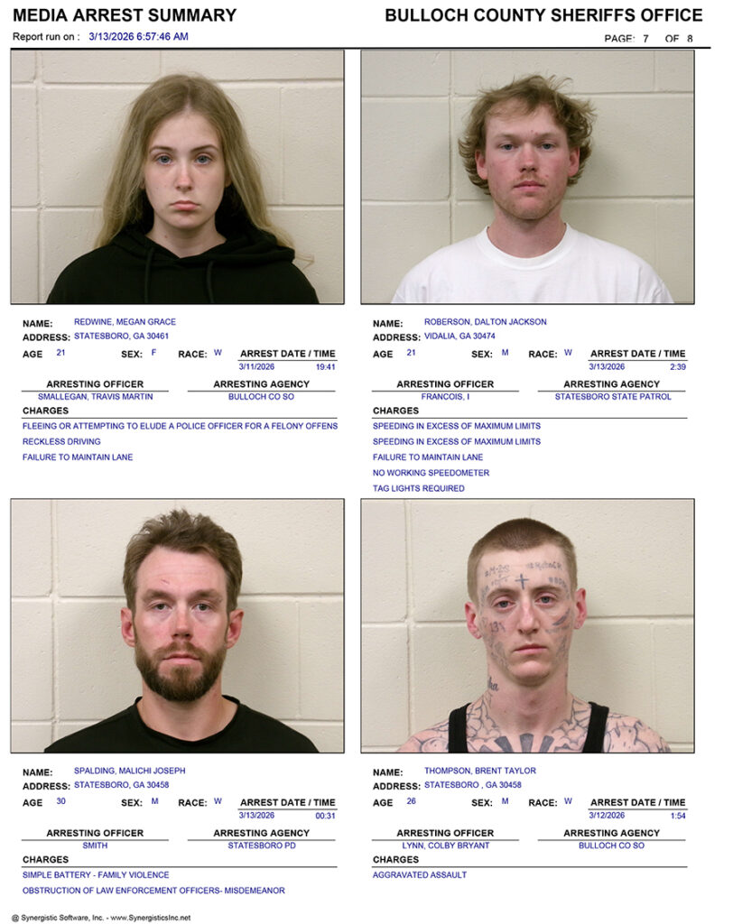 These records are matters of public information provided by the Bulloch County Sheriff’s Office. Booking reports are details of arrests only. All persons below are considered to be innocent unless proven otherwise in a court of law.
