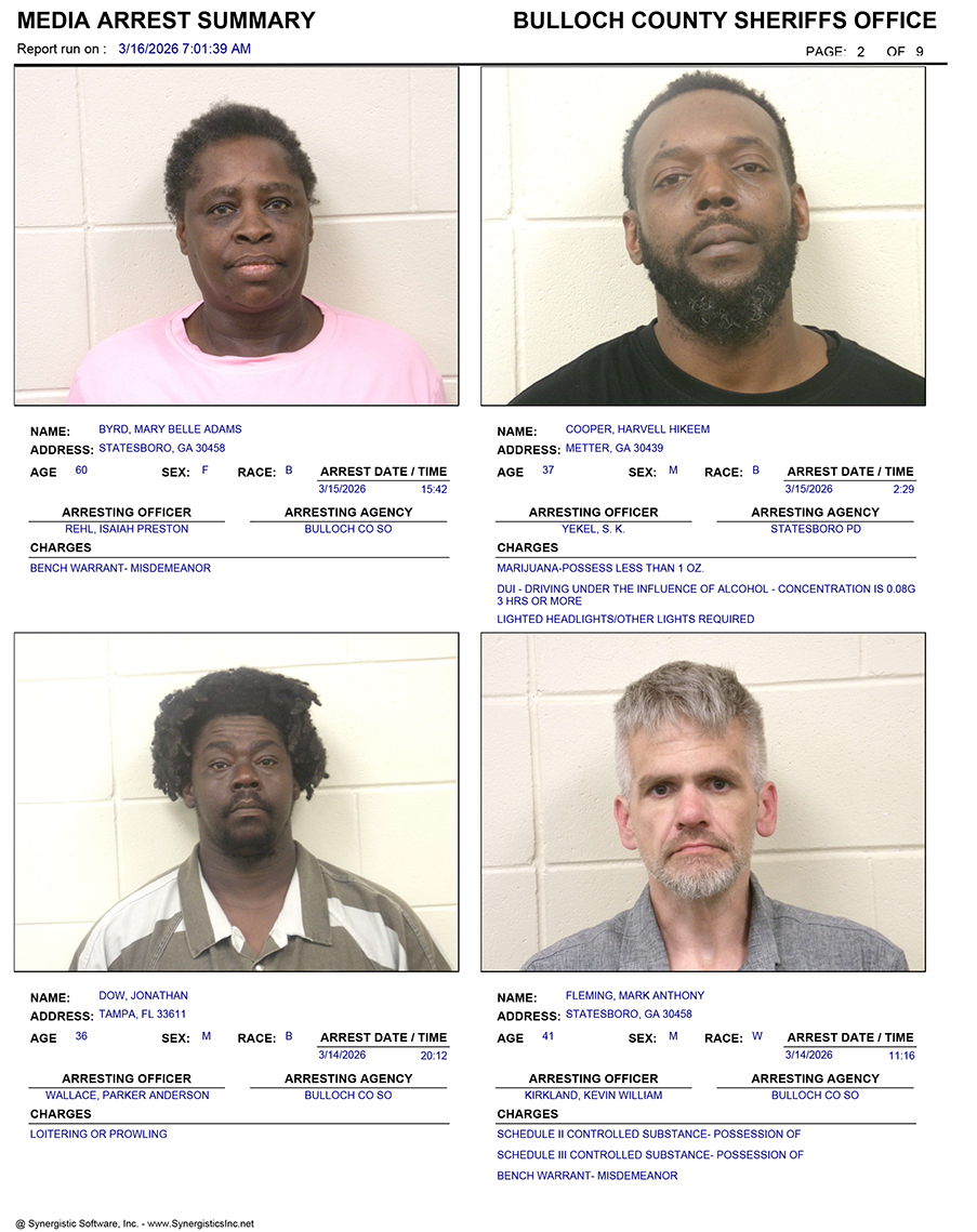 These records are matters of public information provided by the Bulloch County Sheriff’s Office. Booking reports are details of arrests only. All persons below are considered to be innocent unless proven otherwise in a court of law.