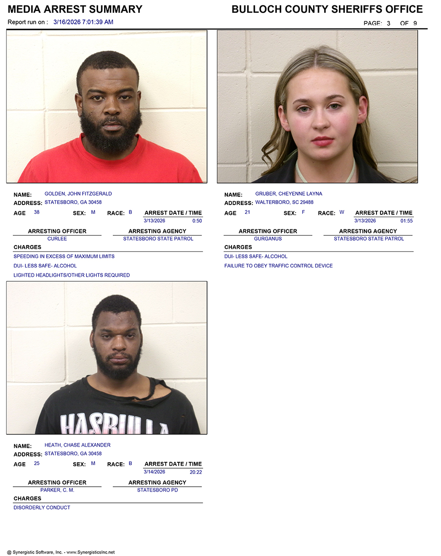 These records are matters of public information provided by the Bulloch County Sheriff’s Office. Booking reports are details of arrests only. All persons below are considered to be innocent unless proven otherwise in a court of law.