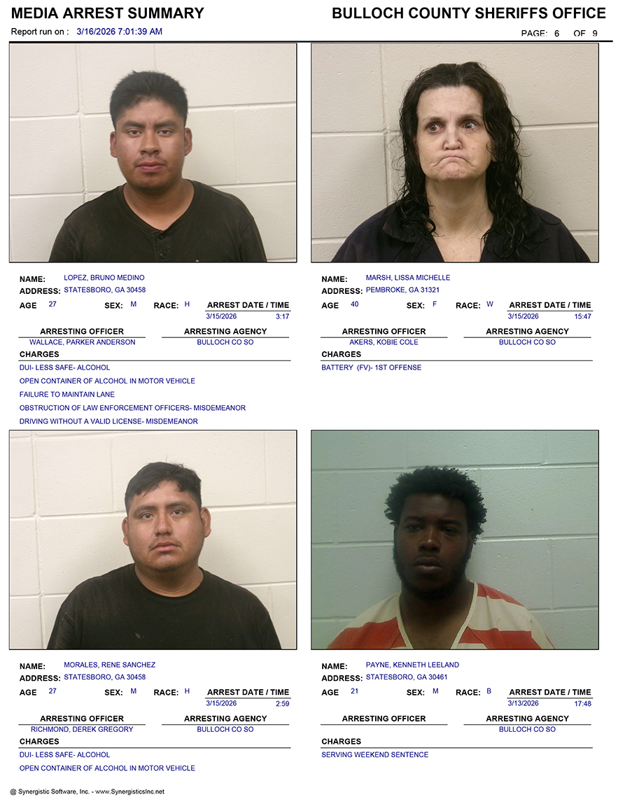 These records are matters of public information provided by the Bulloch County Sheriff’s Office. Booking reports are details of arrests only. All persons below are considered to be innocent unless proven otherwise in a court of law.