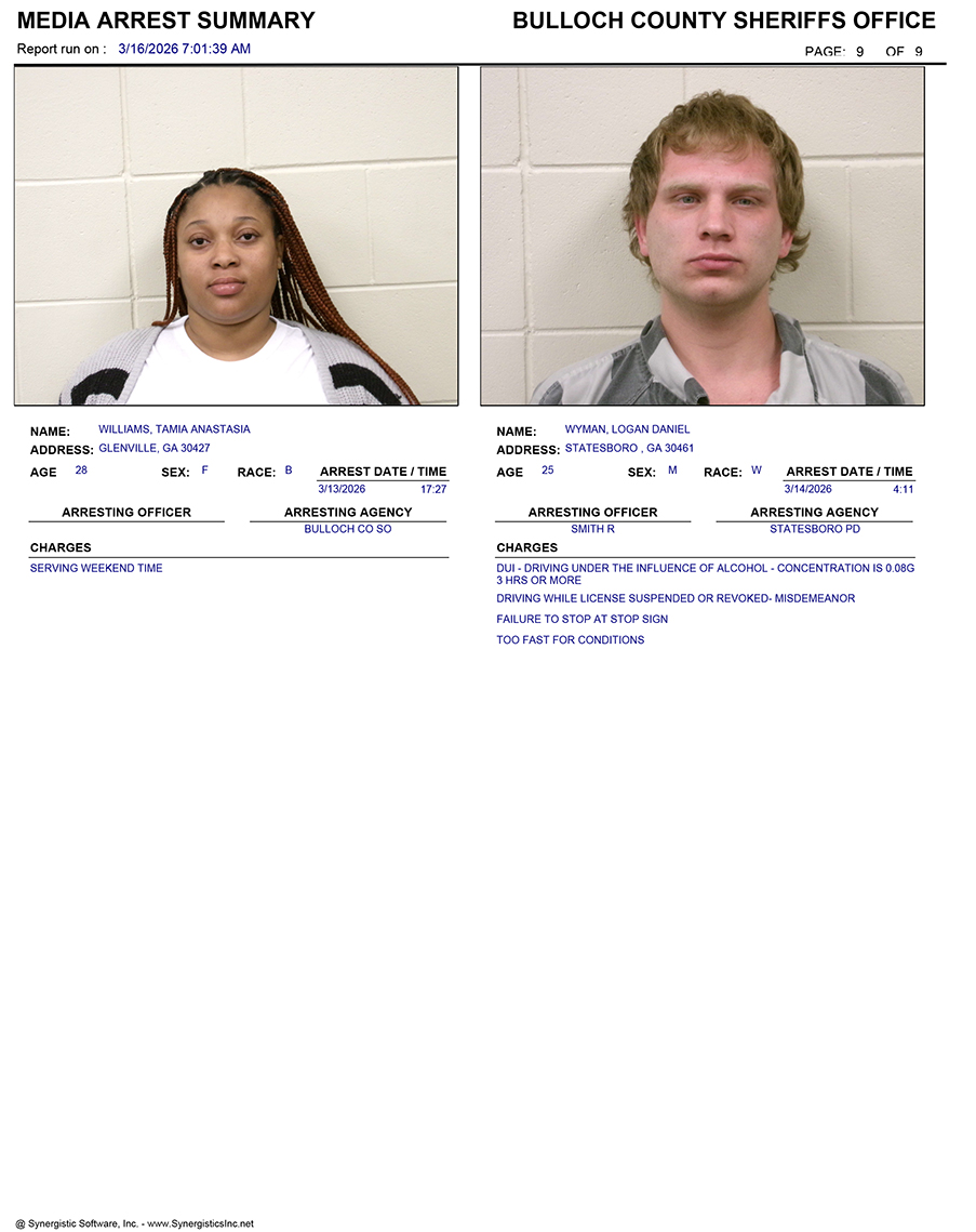 These records are matters of public information provided by the Bulloch County Sheriff’s Office. Booking reports are details of arrests only. All persons below are considered to be innocent unless proven otherwise in a court of law.
