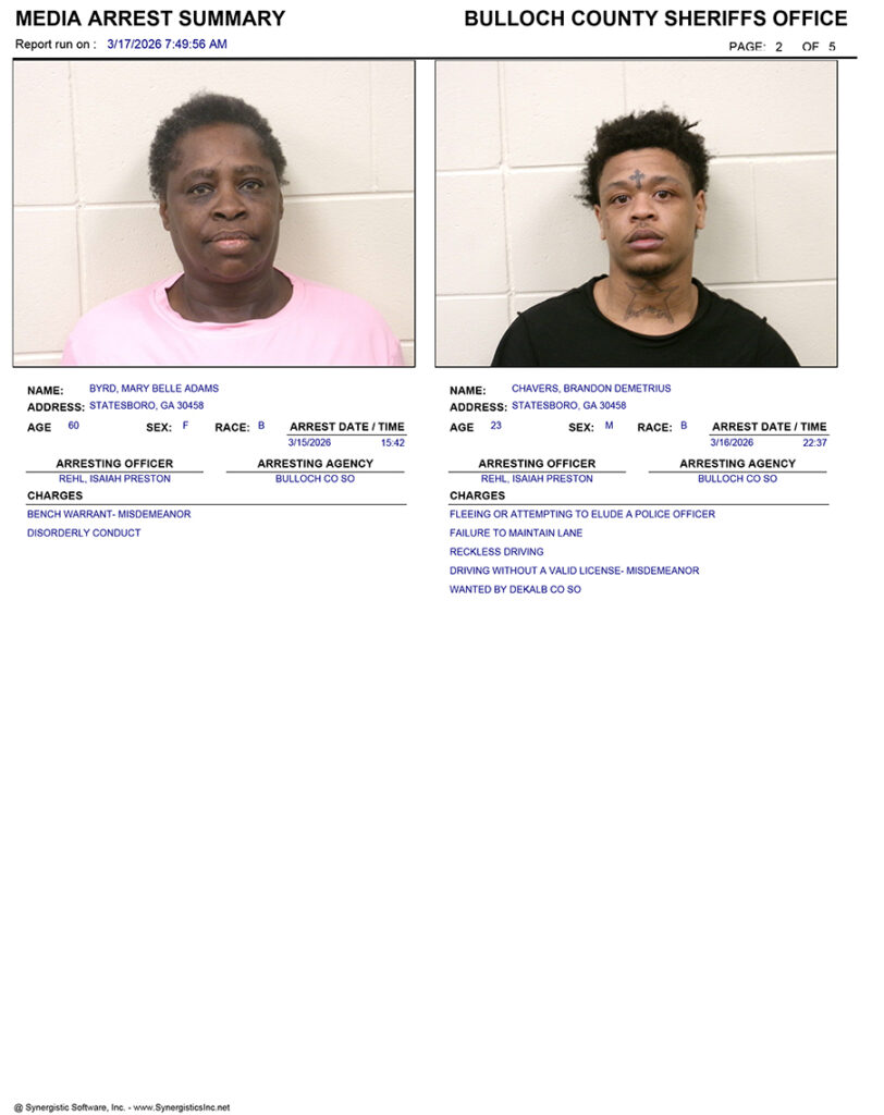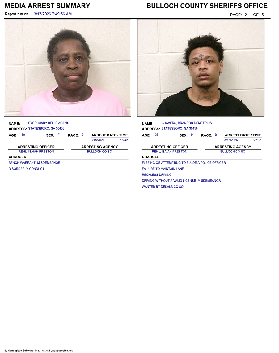 These records are matters of public information provided by the Bulloch County Sheriff’s Office. Booking reports are details of arrests only. All persons below are considered to be innocent unless proven otherwise in a court of law.