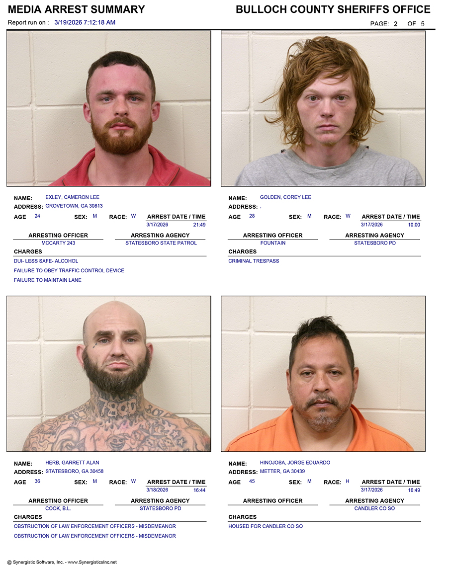 These records are matters of public information provided by the Bulloch County Sheriff’s Office. Booking reports are details of arrests only. All persons below are considered to be innocent unless proven otherwise in a court of law.