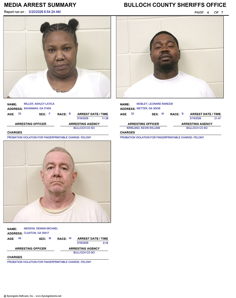 These records are matters of public information provided by the Bulloch County Sheriff’s Office. Booking reports are details of arrests only. All persons below are considered to be innocent unless proven otherwise in a court of law.