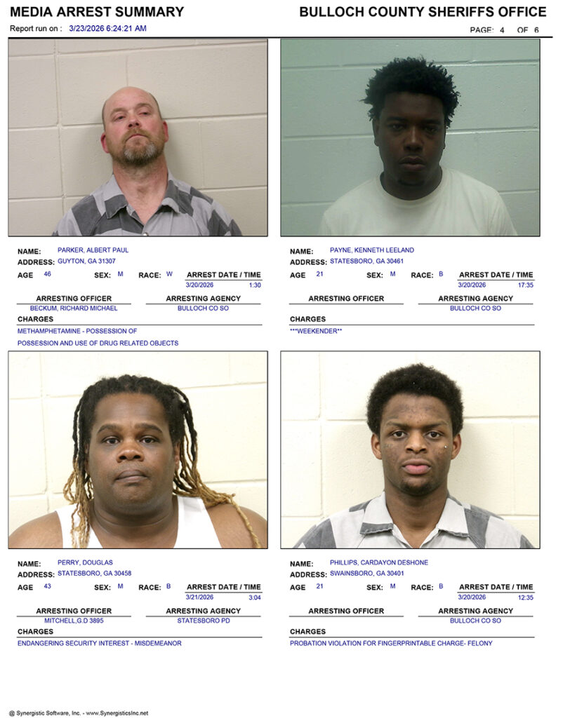 These records are matters of public information provided by the Bulloch County Sheriff’s Office. Booking reports are details of arrests only. All persons below are considered to be innocent unless proven otherwise in a court of law.