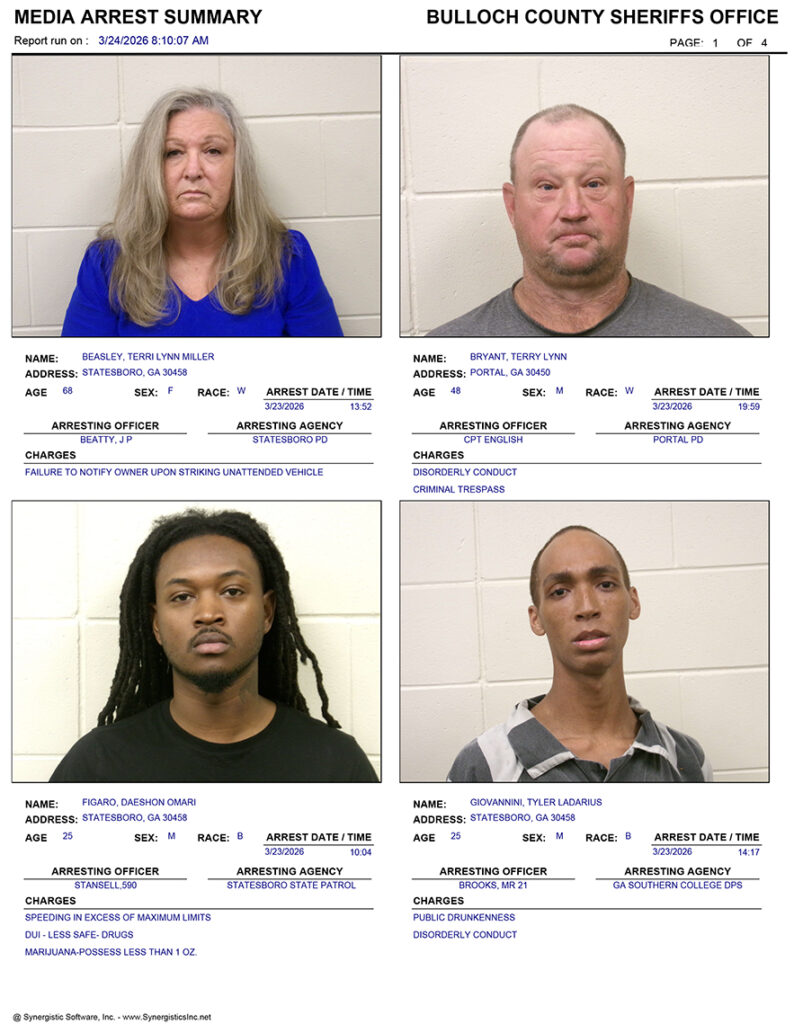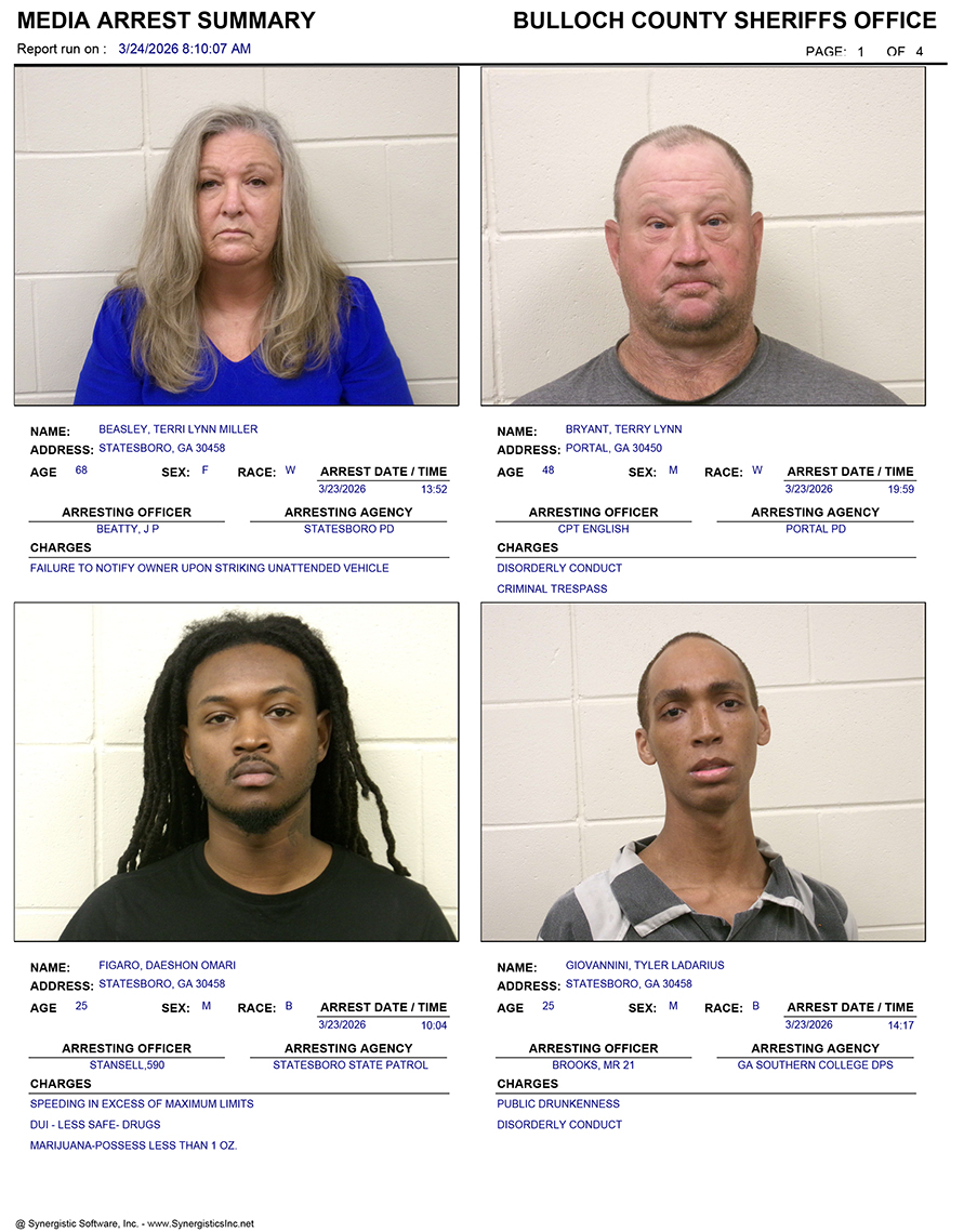 These records are matters of public information provided by the Bulloch County Sheriff’s Office. Booking reports are details of arrests only. All persons below are considered to be innocent unless proven otherwise in a court of law.
