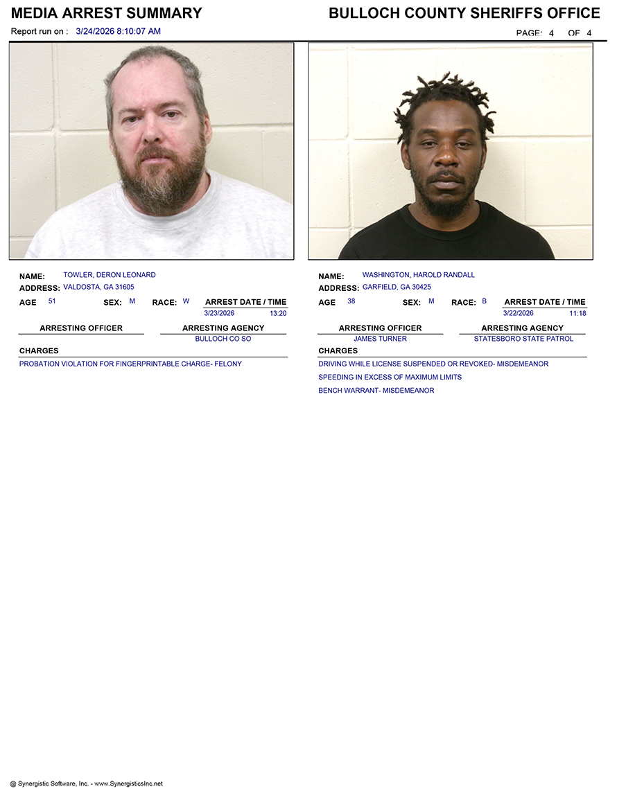 These records are matters of public information provided by the Bulloch County Sheriff’s Office. Booking reports are details of arrests only. All persons below are considered to be innocent unless proven otherwise in a court of law.
