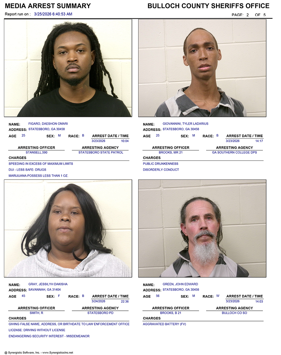 These records are matters of public information provided by the Bulloch County Sheriff’s Office. Booking reports are details of arrests only. All persons below are considered to be innocent unless proven otherwise in a court of law.