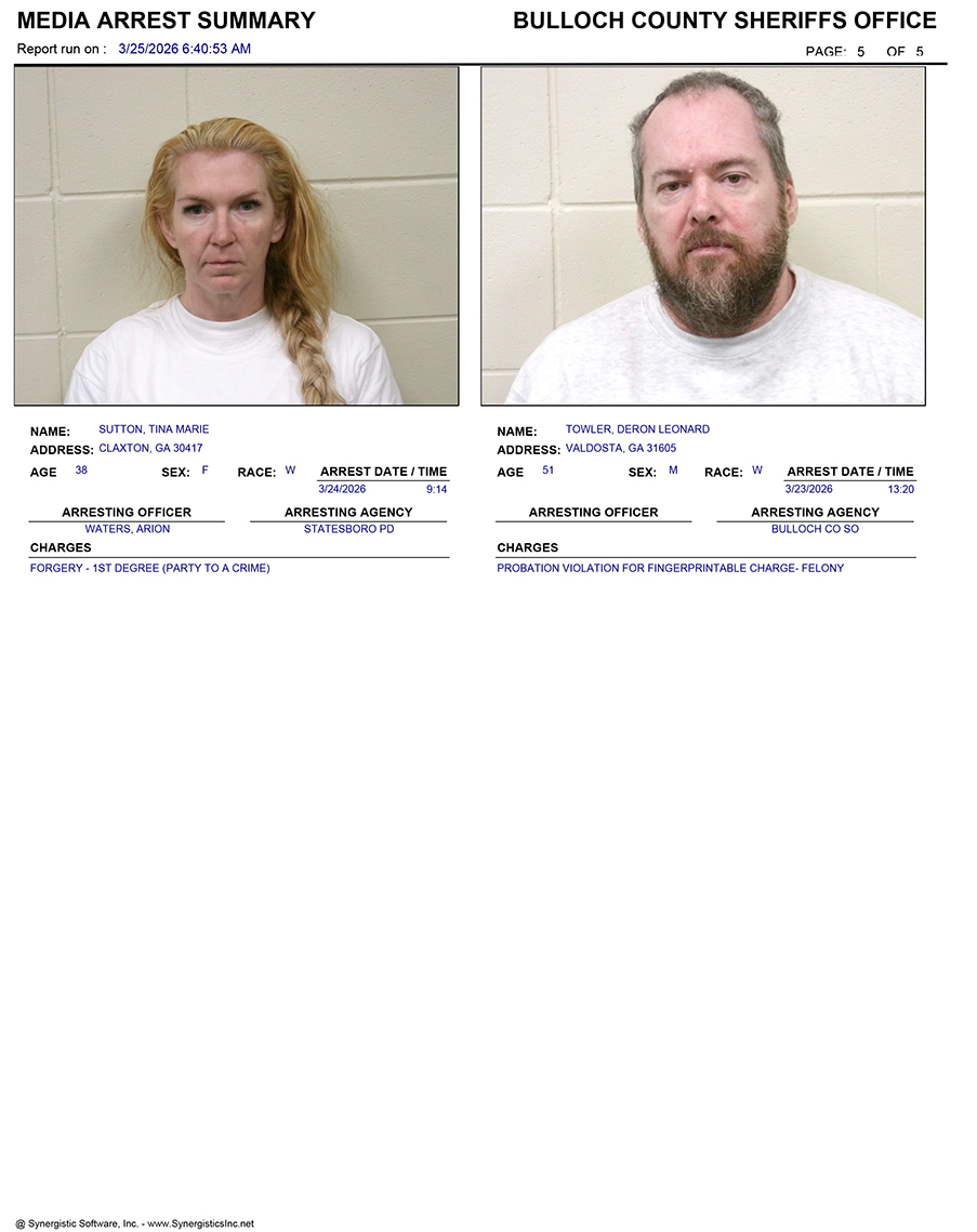 These records are matters of public information provided by the Bulloch County Sheriff’s Office. Booking reports are details of arrests only. All persons below are considered to be innocent unless proven otherwise in a court of law.