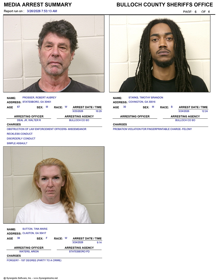 These records are matters of public information provided by the Bulloch County Sheriff’s Office. Booking reports are details of arrests only. All persons below are considered to be innocent unless proven otherwise in a court of law.