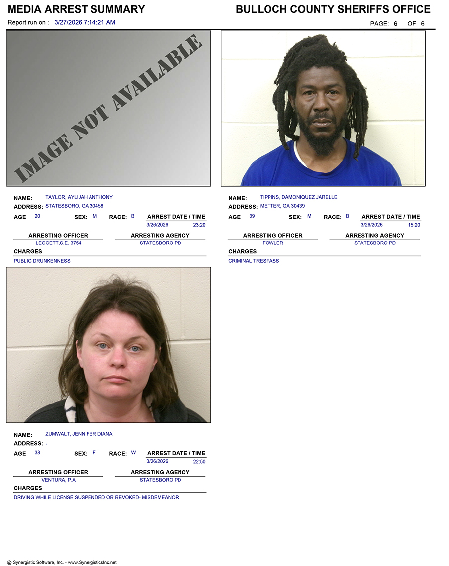 These records are matters of public information provided by the Bulloch County Sheriff’s Office. Booking reports are details of arrests only. All persons below are considered to be innocent unless proven otherwise in a court of law.
