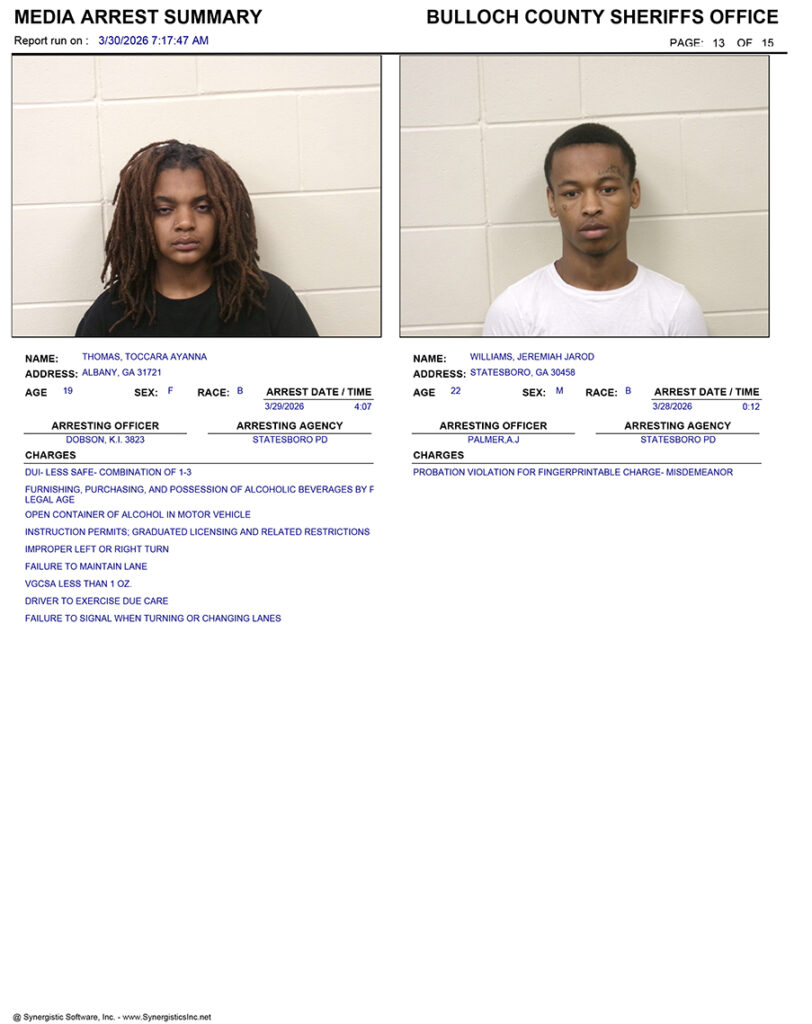 These records are matters of public information provided by the Bulloch County Sheriff’s Office. Booking reports are details of arrests only. All persons below are considered to be innocent unless proven otherwise in a court of law.