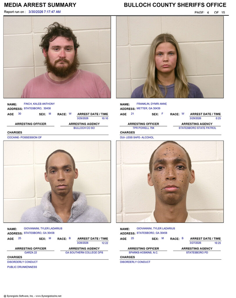 These records are matters of public information provided by the Bulloch County Sheriff’s Office. Booking reports are details of arrests only. All persons below are considered to be innocent unless proven otherwise in a court of law.