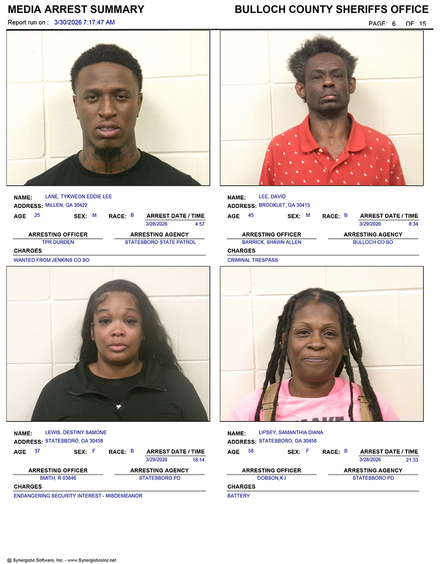 These records are matters of public information provided by the Bulloch County Sheriff’s Office. Booking reports are details of arrests only. All persons below are considered to be innocent unless proven otherwise in a court of law.