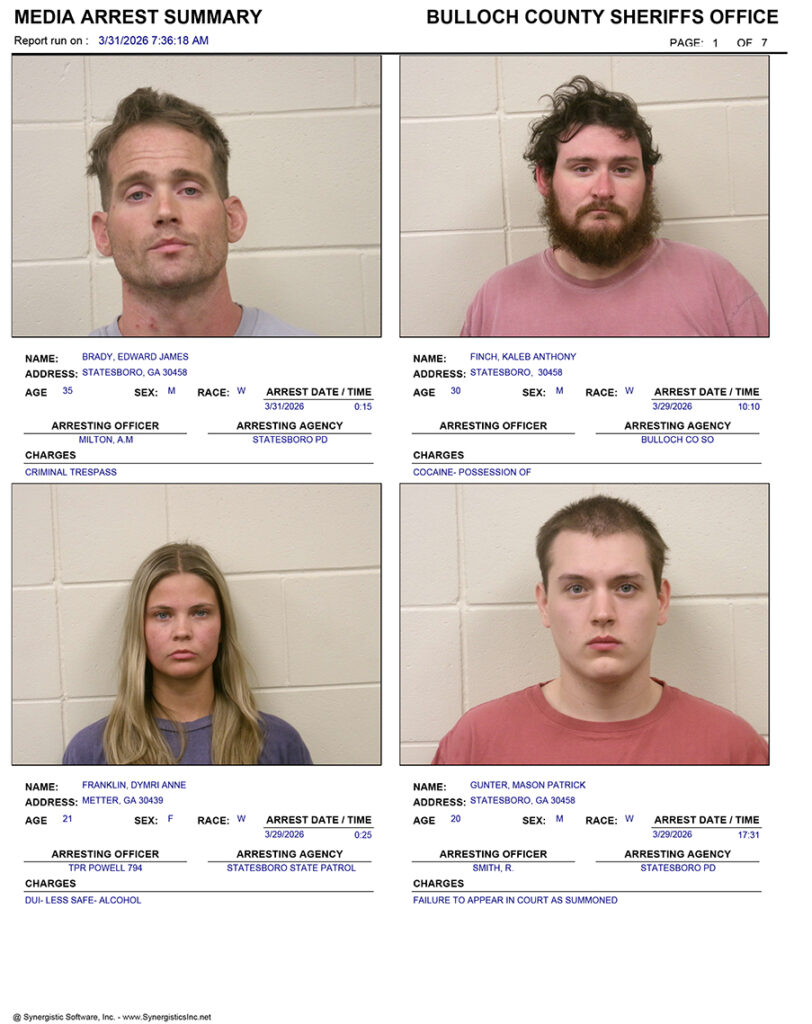 These records are matters of public information provided by the Bulloch County Sheriff’s Office. Booking reports are details of arrests only. All persons below are considered to be innocent unless proven otherwise in a court of law.