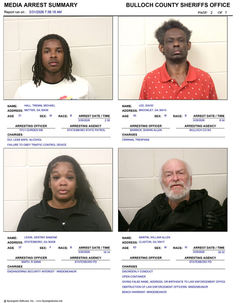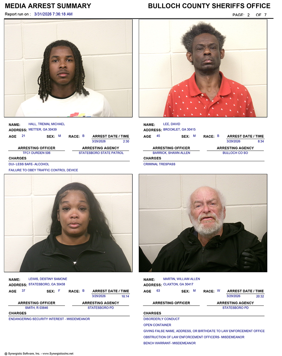 These records are matters of public information provided by the Bulloch County Sheriff’s Office. Booking reports are details of arrests only. All persons below are considered to be innocent unless proven otherwise in a court of law.