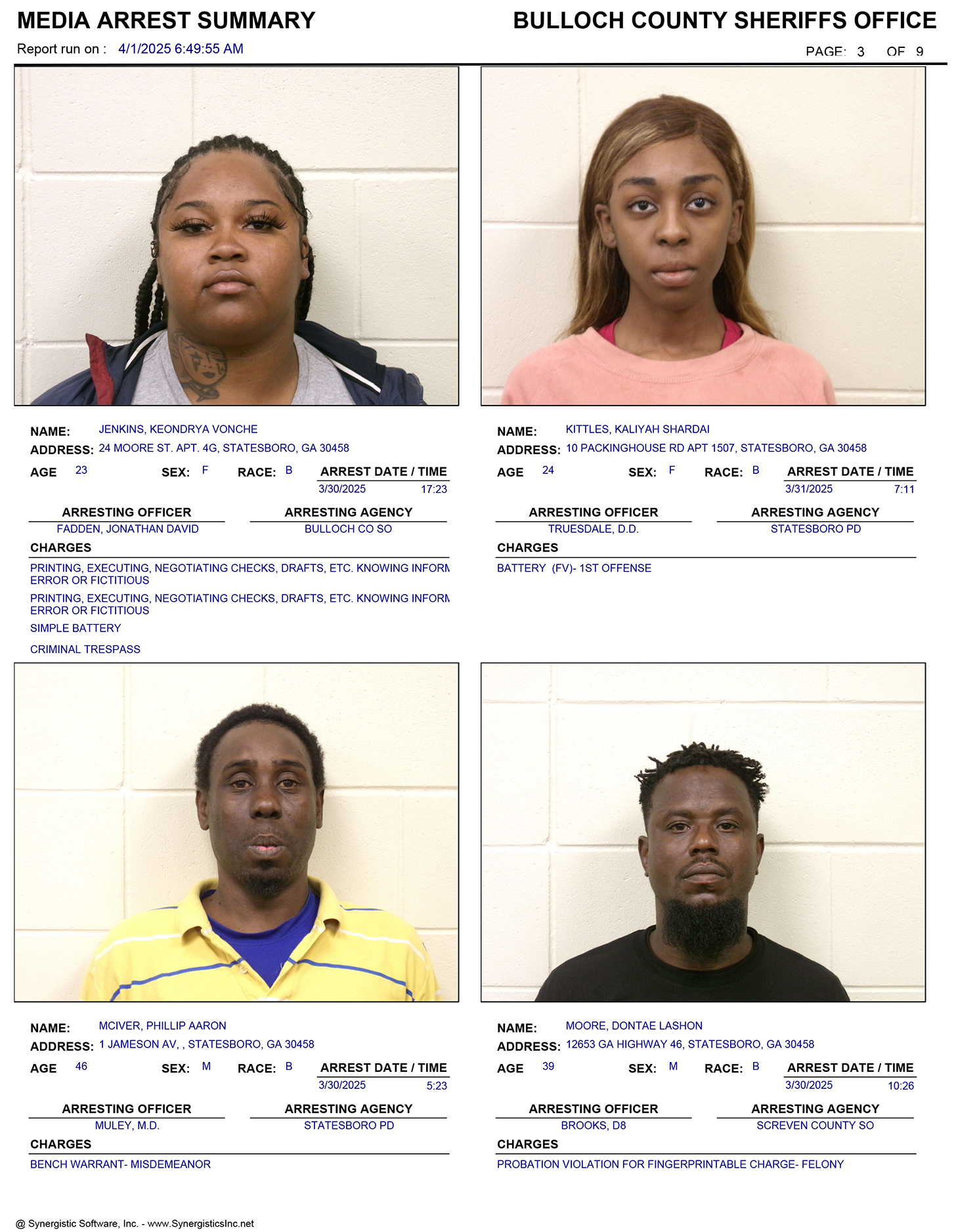 These records are matters of public information provided by the Bulloch County Sheriff’s Office. Booking reports are details of arrests only. All persons below are considered to be innocent unless proven otherwise in a court of law.