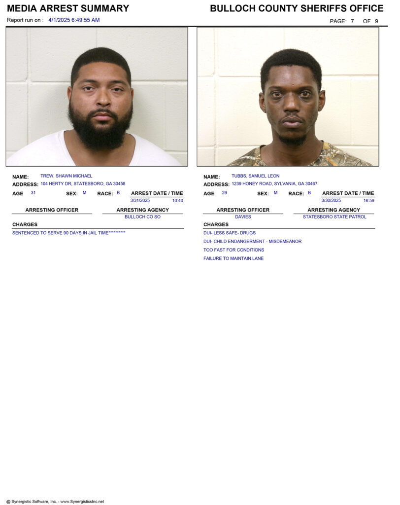These records are matters of public information provided by the Bulloch County Sheriff’s Office. Booking reports are details of arrests only. All persons below are considered to be innocent unless proven otherwise in a court of law.